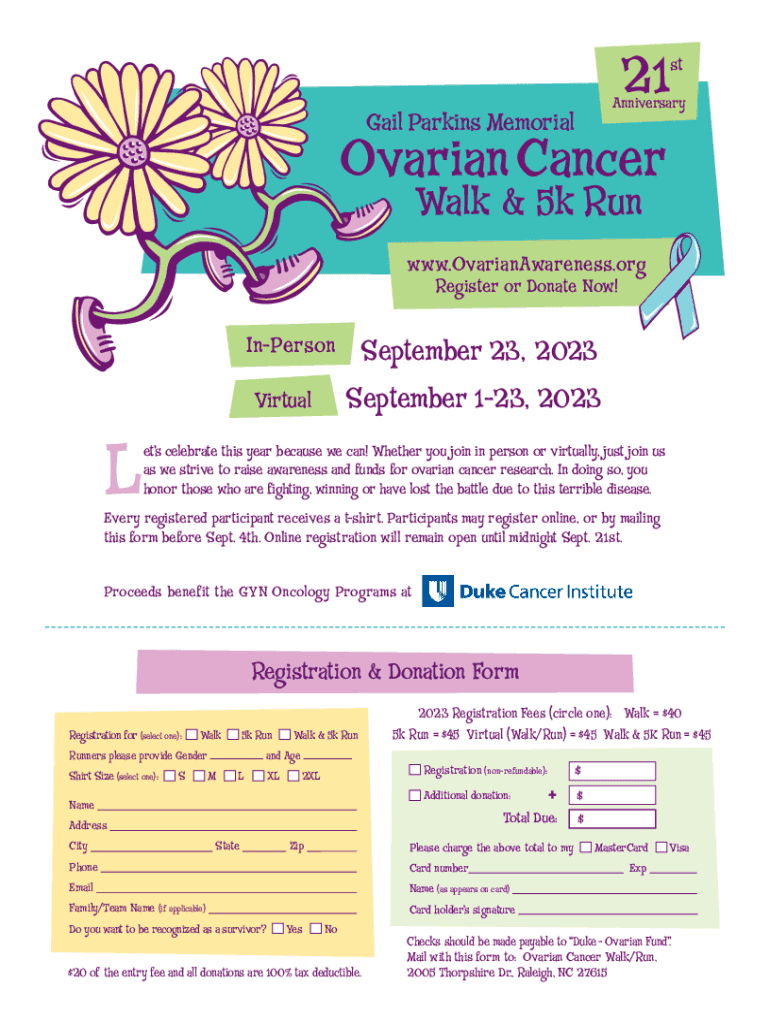 21stAnniversaryGail Parkins MemorialOvarian Cancer Walk & 5k Runwww.OvarianAwareness.org Register or Donate Now!InPersonSeptember 23, 2023 September 123, 2023VirtualLets celebrate this year because
