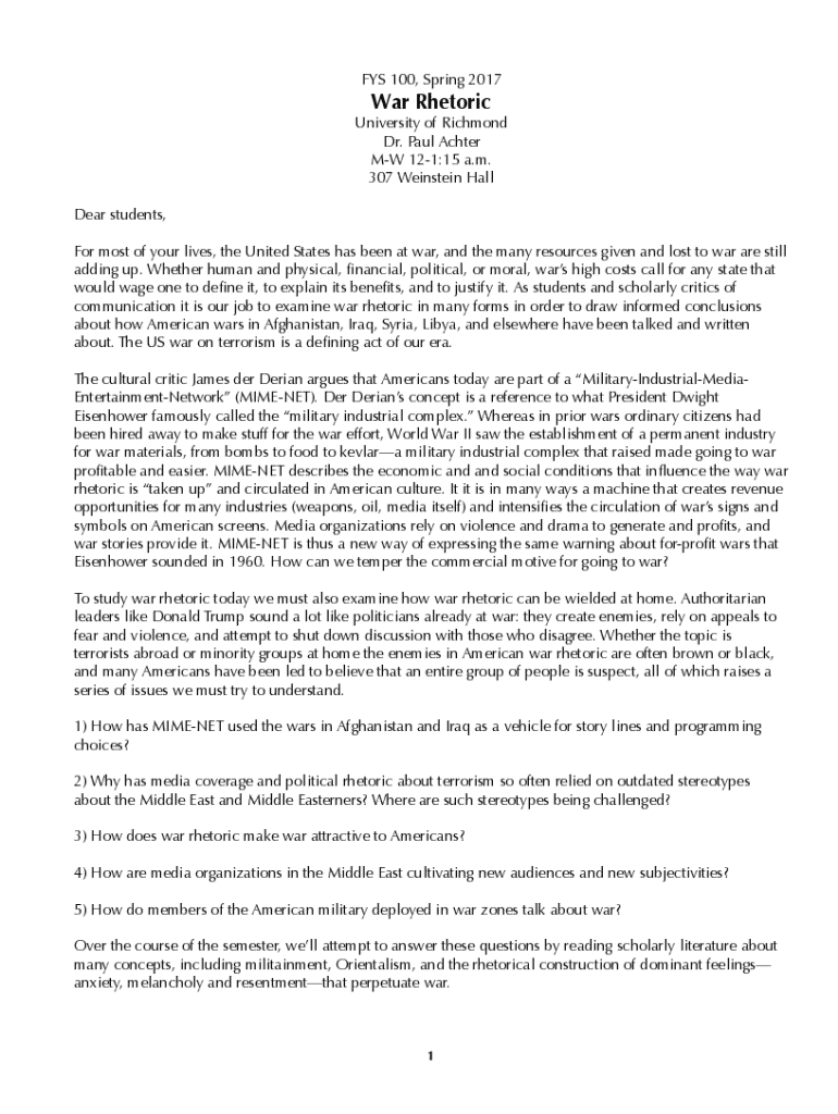 FYS 100, Spring 2017War RhetoricUniversity of Richmond Dr. Paul Achter MW 121:15 a.m. 307 Weinstein Hall Dear students, For most of your lives, the United States has been at war, and the many resources