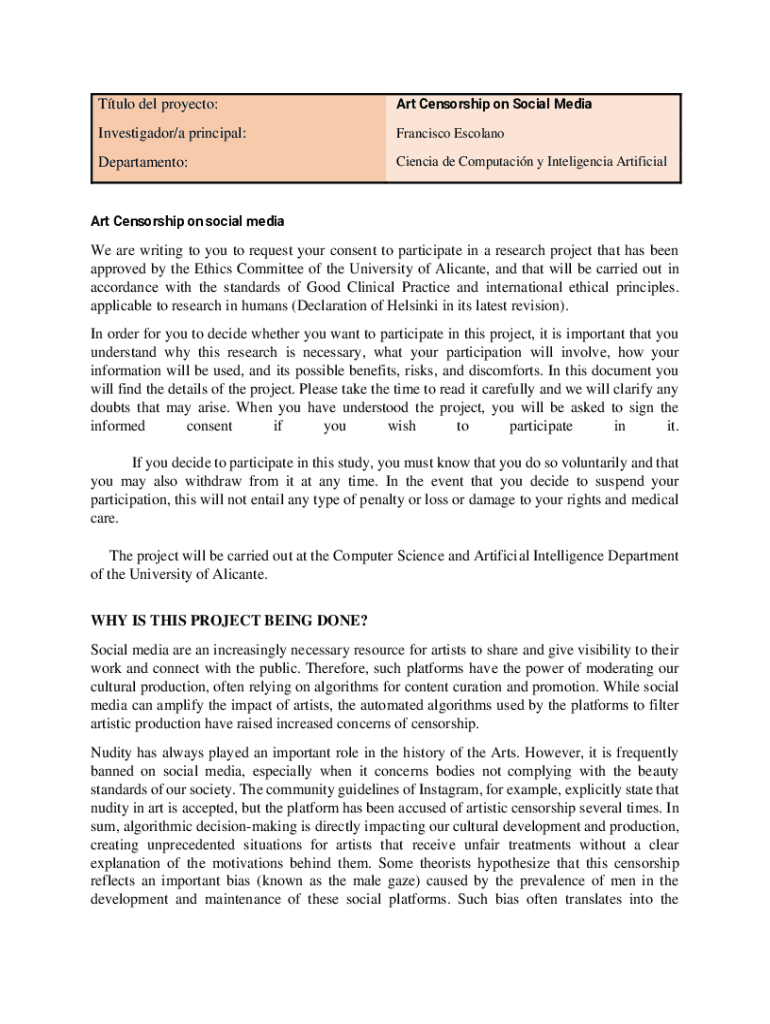 Ttulo del proyecto:Art Censorship on Social MediaInvestigador/a principal:Francisco EscolanoDepartamento:Ciencia de Computacin y Inteligencia ArtificialArt Censorship on social mediaWe are writing