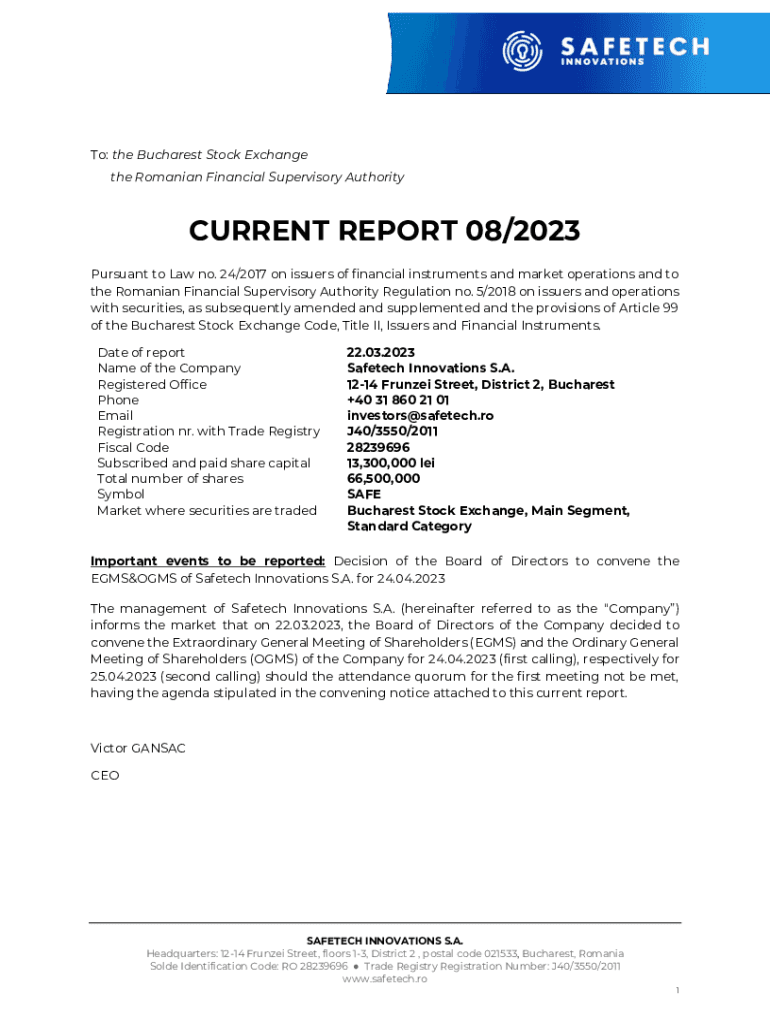 To: the Bucharest Stock Exchange the Romanian Financial Supervisory AuthorityCURRENT REPORT 08/2023 Pursuant to Law no. 24/2017 on issuers of financial instruments and market operations and to the