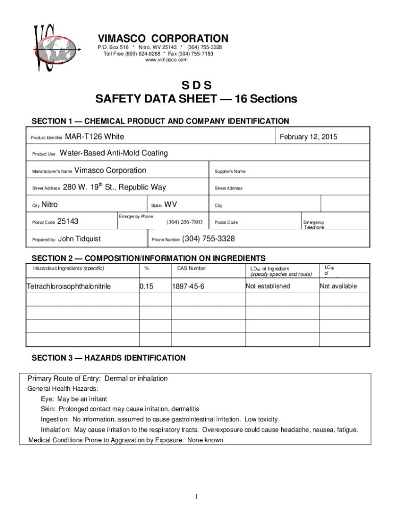 VIMASCO CORPORATION P.O. Box 516 * Nitro, WV 25143 * (304) 7553328 Toll Free (800) 6248288 * Fax (304) 7557153 www.vimasco.comSDS SAFETY DATA SHEET 16 Sections SECTION 1 CHEMICAL PRODUCT AND COMPANY