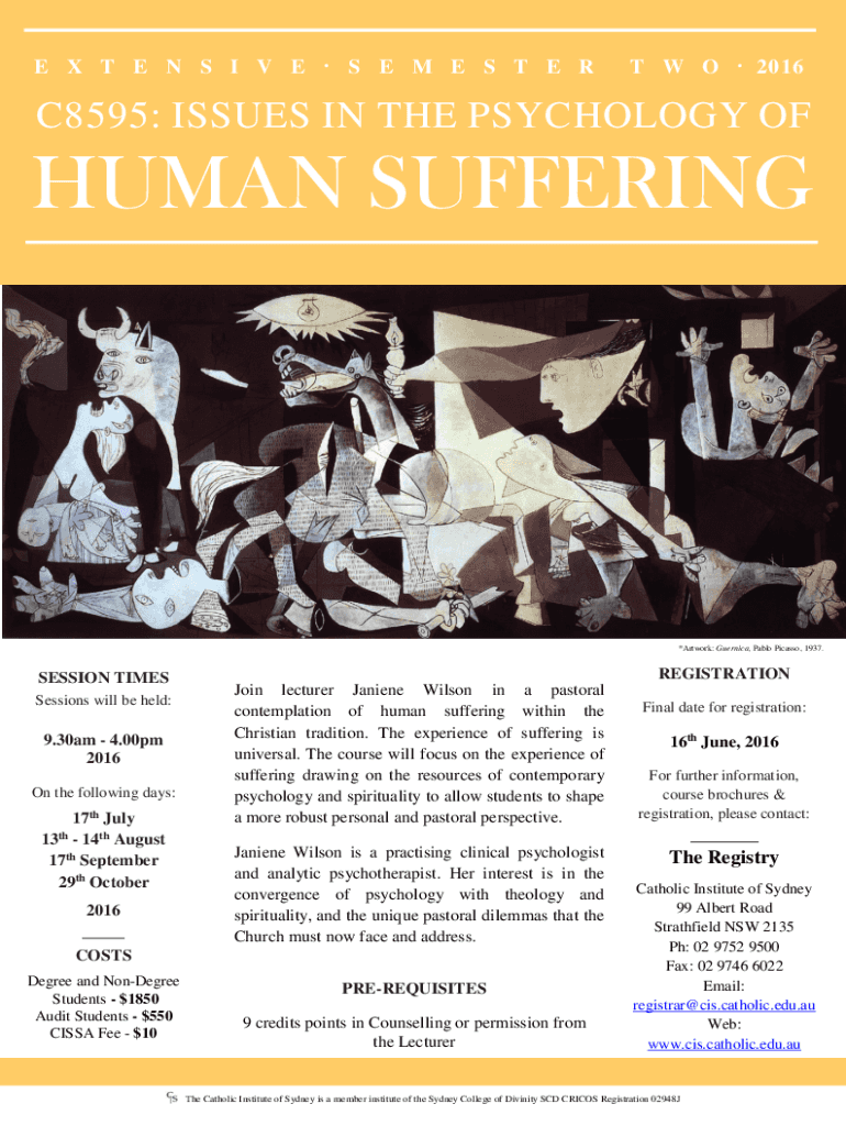 E X T E N S I V E S E M E S T E RT W O 2016C8595: ISSUES IN THE PSYCHOLOGY OFHUMAN SUFFERING*Artwork: Guernica, Pablo Picasso, 1937.SESSION TIMES Sessions will be held:9.30am 4.00pm 2016 On the following