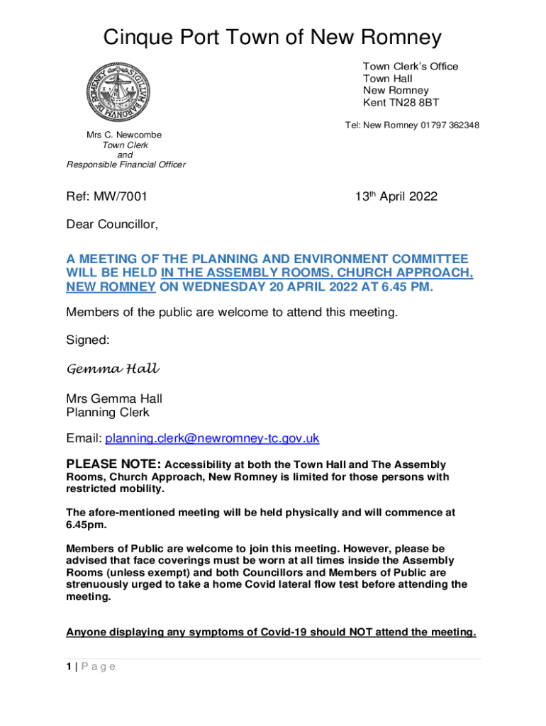 Cinque Port Town of New Romney Town Clerks Office Town Hall New Romney Kent TN28 8BT Tel: New Romney 01797 362348 Mrs C. Newcombe Town Clerk and Responsible Financial OfficerRef: MW/700113th April