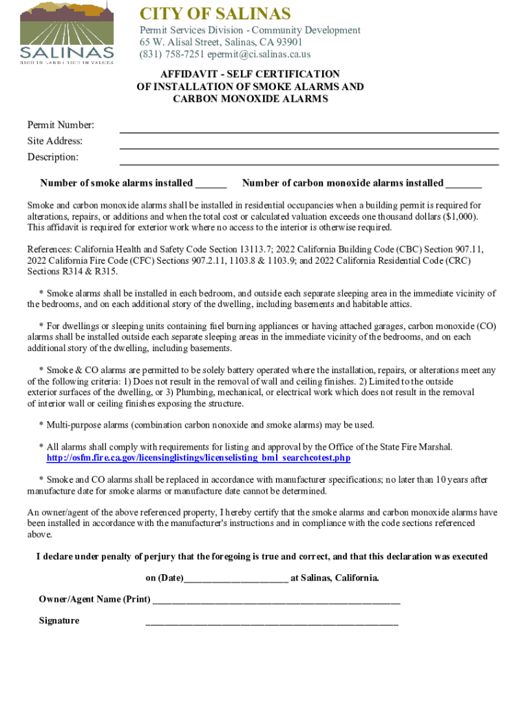 CITY OF SALINASPermit Services Division Community Development 65 W. Alisal Street, Salinas, CA 93901 (831) 7587251 epermit@ci.salinas.ca.us AFFIDAVIT SELF CERTIFICATION OF INSTALLATION OF SMOKE ALARMS