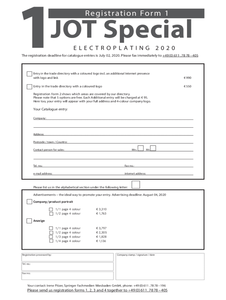 1Re gist rat io n Fo rm 1JOT Special ELECTROPLATING 2020The registration deadline for catalogue entries is July 02, 2020. Please fax immediately to +49(0)611.7878405Entry in the trade directory with