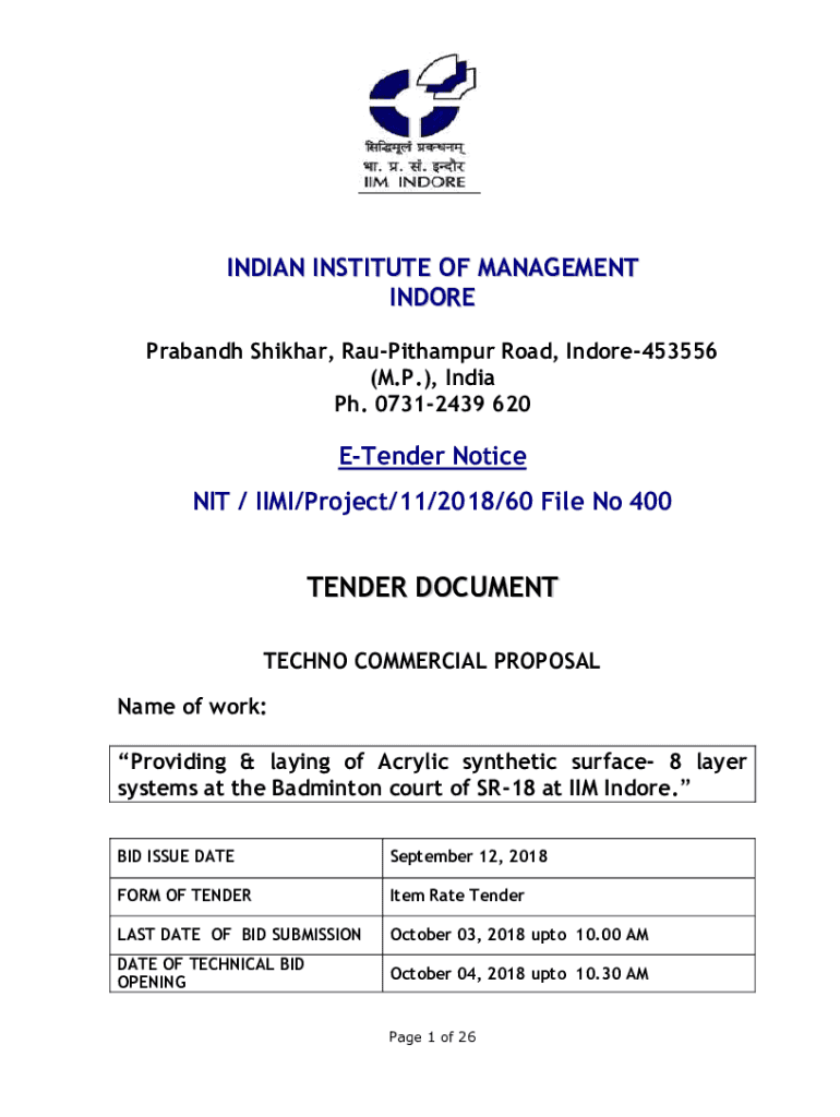 INDIAN INSTITUTE OF MANAGEMENT INDORE Prabandh Shikhar, RauPithampur Road, Indore453556 (M.P.), India Ph. 07312439 620ETender Notice NIT / IIMI/Project/11/2018/60 File No 400TENDER DOCUMENT TECHNO