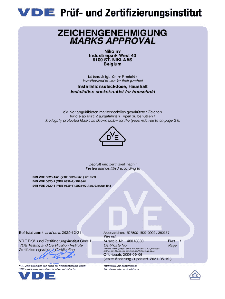 ZEICHENGENEHMIGUNG MARKS APPROVAL Niko nv Industriepark West 40 9100 ST. NIKLAAS Belgium ist berechtigt, fr ihr Produkt / is authorized to use for their productInstallationssteckdose, Haushalt Installation
