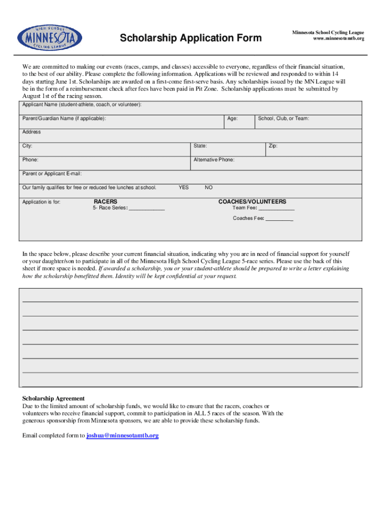 Minnesota School Cycling League www.minnesotamtb.orgScholarship Application FormWe are committed to making our events (races, camps, and classes) accessible to everyone, regardless of their financial