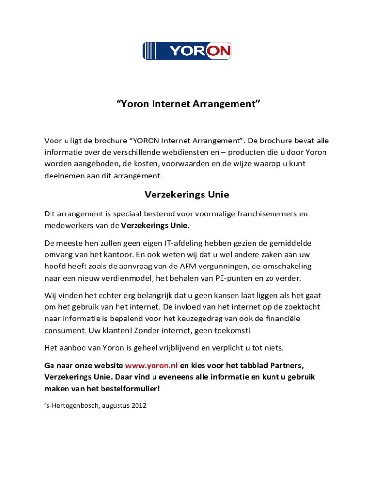 Yoron Internet ArrangementVoor u ligt de brochure YORON Internet Arrangement. De brochure bevat alle informatie over de verschillende webdiensten en producten die u door Yoron worden aangeboden, de