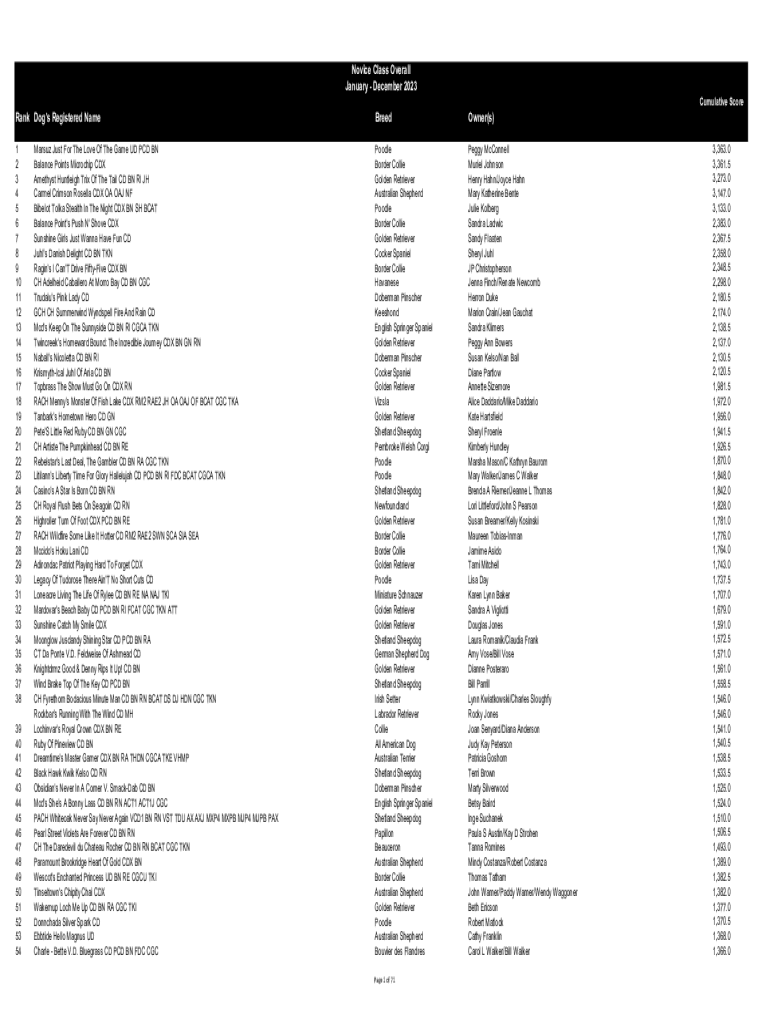 Novice Class Overall January December 2023 Cumulative ScoreRank Dog\'s Registered NameBreedOwner(s)1 2 3 4 5 6 7 8 9 10 11 12 13 14 15 16 17 18 19 20 21 22 23 24 25 26 27 28 29 30 31 32 33 34 35 36