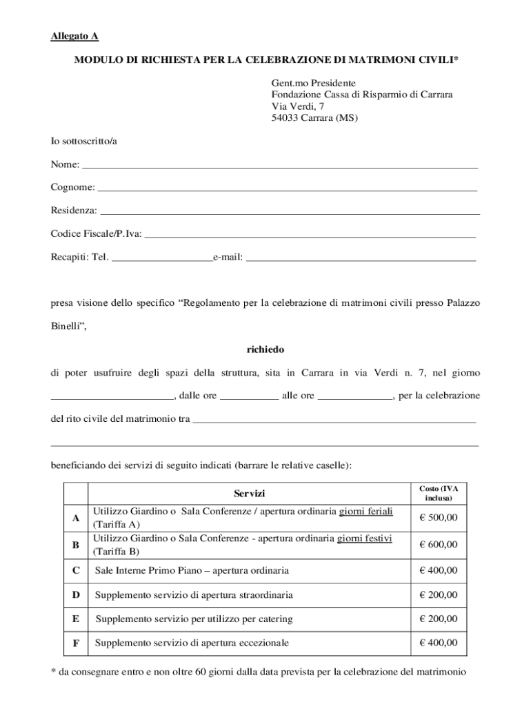 Allegato A MODULO DI RICHIESTA PER LA CELEBRAZIONE DI MATRIMONI CIVILI* Gent.mo Presidente Fondazione Cassa di Risparmio di Carrara Via Verdi, 7 54033 Carrara (MS) Io sottoscritto/a Nome: ___ Cognome:
