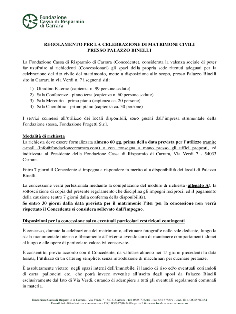 REGOLAMENTO PER LA CELEBRAZIONE DI MATRIMONI CIVILI PRESSO PALAZZO BINELLI La Fondazione Cassa di Risparmio di Carrara (Concedente), considerata la valenza sociale di poter far usufruire ai richiedenti