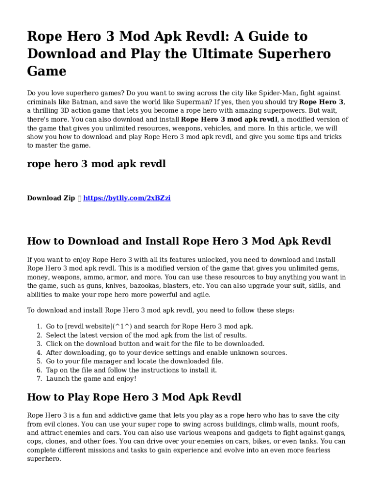 Rope Hero 3 Mod Apk Revdl: A Guide to Download and Play the Ultimate Superhero Game Do you love superhero games? Do you want to swing across the city like SpiderMan, fight against criminals like Batman,