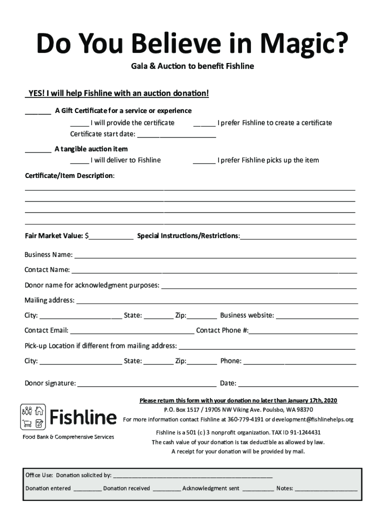 Do You Believe in Magic? Gala & Auction to benefit Fishline YES! I will help Fishline with an auction donation! ___ A Gift Certificate for a service or experience ___ I will provide the certificate