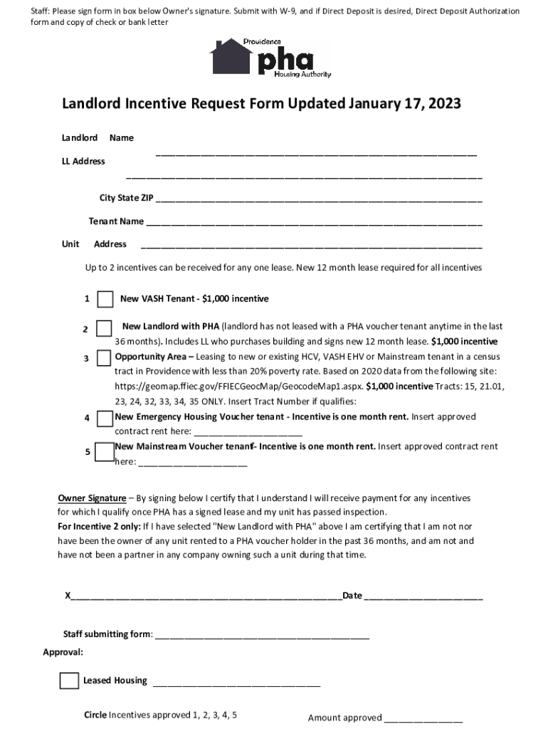 Staff: Please sign form in box below Owner\'s signature. Submit with W9, and if Direct Deposit is desired, Direct Deposit Authorization form and copy of check or bank letterLandlord Incentive Request