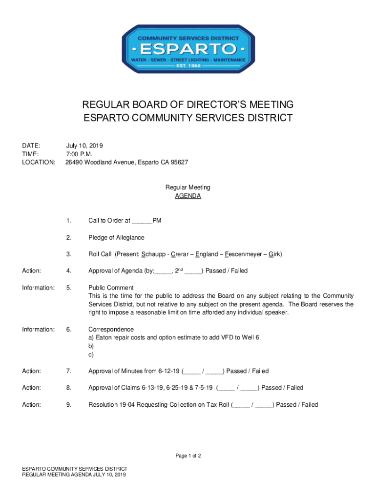 REGULAR BOARD OF DIRECTORS MEETING ESPARTO COMMUNITY SERVICES DISTRICT DATE: TIME: LOCATION:July 10, 2019 7:00 P.M. 26490 Woodland Avenue, Esparto CA 95627Regular Meeting AGENDA1.Call to Order at