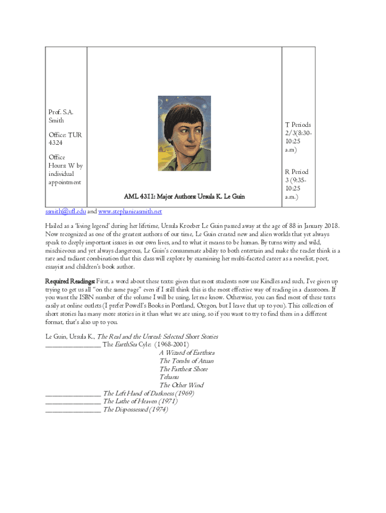 Prof. S.A. SmithT Periods 2/3(8:3010:25 a.m)Office: TUR 4324 Office Hours: W by individual appointment AML 4311: Major Authors: Ursula K. Le GuinR Period 3 (9:3510:25 a.m.)ssmith@ufl.edu and www.stephanieasmith.net