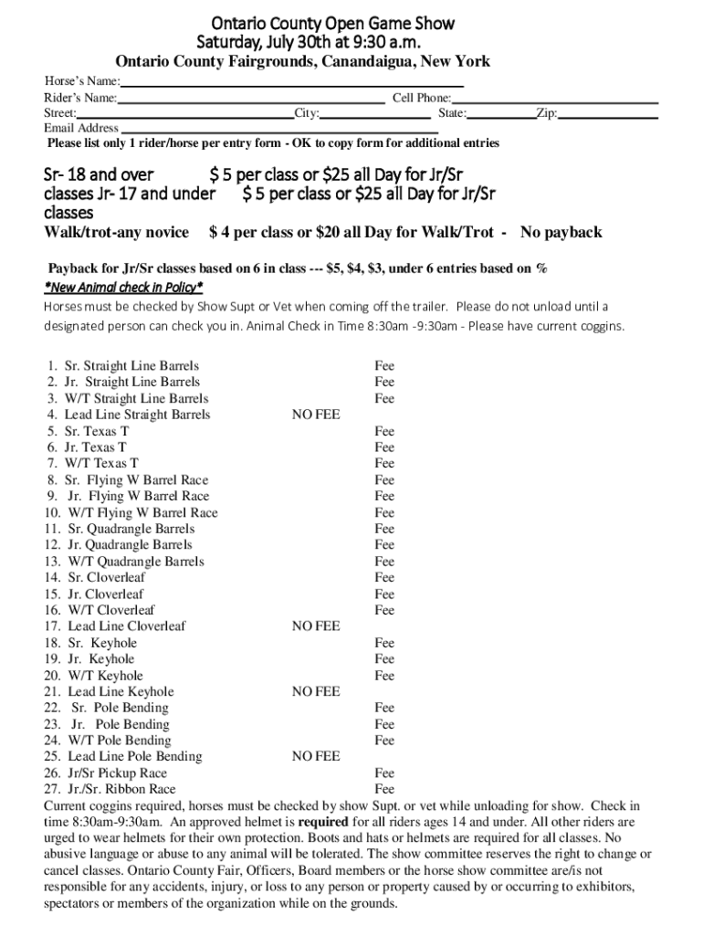 Ontario County Open Game Show Saturday, July 30th at 9:30 a.m. Ontario County Fairgrounds, Canandaigua, New York Horses Name: Riders Name: Cell Phone: Street: City: State: Email Address Please list