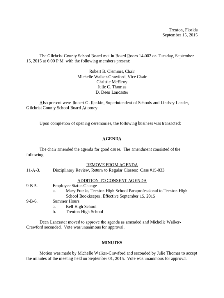 Instructions for the form The Gilchrist County School Board met in Board Room 14-002 on Tuesday, September 15, 2015 at 6:00 P