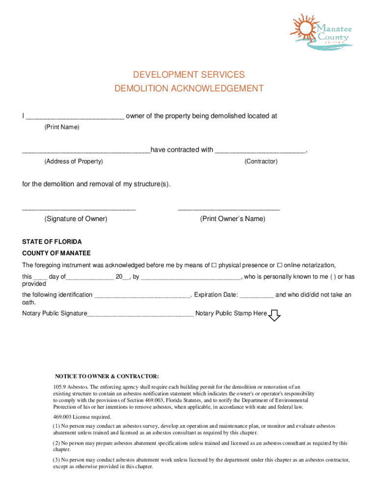 DEVELOPMENT SERVICES DEMOLITION ACKNOWLEDGEMENT I ___ owner of the property being demolished located at (Print Name)___have contracted with ___, (Address of Property)(Contractor)for the demolition
