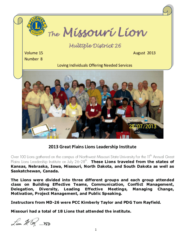 TheMissouri Lion Multiple District 26.Volume 15 Number 8August 20132013Loving GreatIndividuals Plains Lions Leadership Institute Offering Needed Services2013 Great Plains Lions Leadership Institute