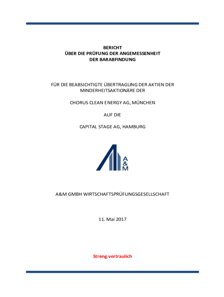 BERICHT BER DIE PRFUNG DER ANGEMESSENHEIT DER BARABFINDUNGFR DIE BEABSICHTIGTE BERTRAGUNG DER AKTIEN DER MINDERHEITSAKTIONRE DER CHORUS CLEAN ENERGY AG, MNCHEN AUF DIE CAPITAL STAGE AG, HAMBURGA&M