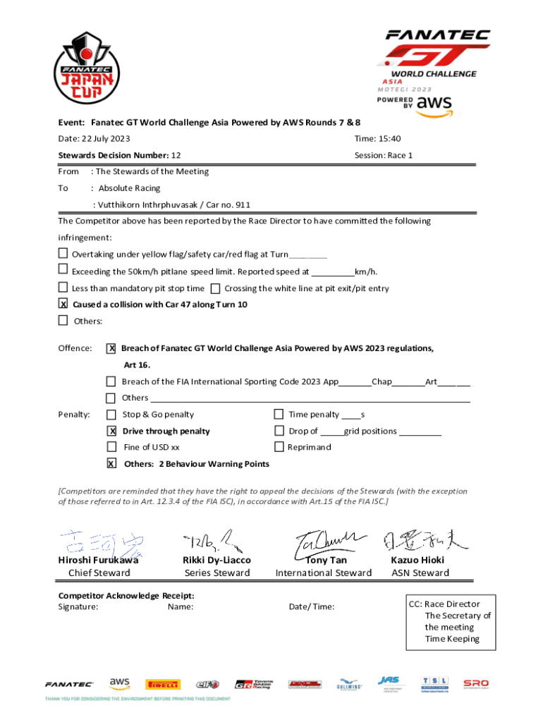 Event: Fanatec GT World Challenge Asia Powered by AWS Rounds 7 & 8 Date: 22 July 2023Time: 15:40Stewards Decision Number: 12Session: Race 1From: The Stewards of the MeetingTo: Absolute Racing : Vutthikorn