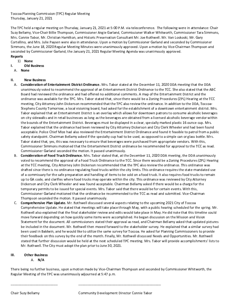 Toccoa Planning Commission (TPC) Regular Meeting Thursday, January 21, 2021 The TPC held a regular meeting on Thursday, January 21, 2021 at 5:00 P.M. via teleconference. The following were in attendance: