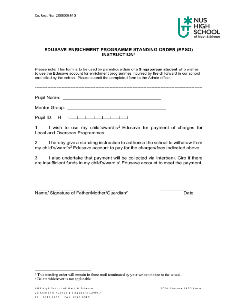 Co.Reg.No:200500354GEDUSAVE ENRICHMENT PROGRAMME STANDING ORDER (EPSO) INSTRUCTION1 Please note: This form is to be used by parent/guardian of a Singaporean student who wishes to use the Edusave account
