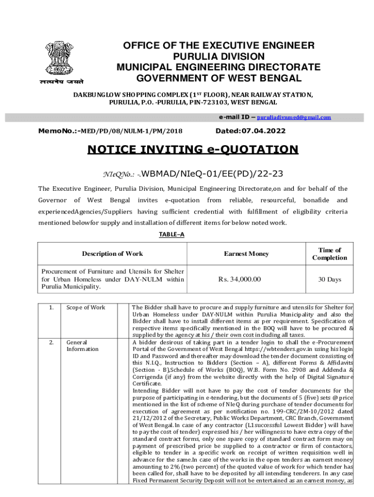 OFFICE OF THE EXECUTIVE ENGINEER PURULIA DIVISION MUNICIPAL ENGINEERING DIRECTORATE GOVERNMENT OF WEST BENGAL DAKBUNGLOW SHOPPING COMPLEX (1ST FLOOR), NEAR RAILWAY STATION, PURULIA, P.O. PURULIA,