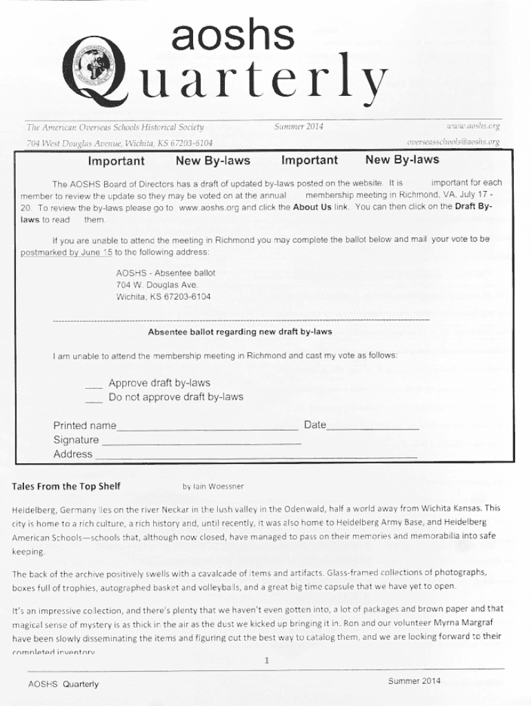 The American Overseas Schools Historical SocietySummer 2014www.aoshs.org704 West Douglas Avenue, Wichita, KS 672036104Importantoverseasschools@aoshs.orgNew BylawsImportantNew BylawsThe
