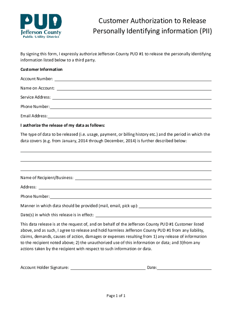 Customer Authorization to Release Personally Identifying information (PII) By signing this form, I expressly authorize Jefferson County PUD #1 to release the personally identifying information listed