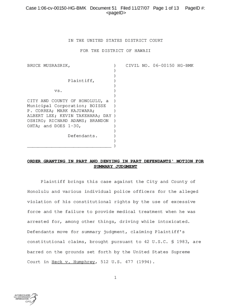 Case 1:06cv00150HGBMK Document 51 Filed 11/27/07 Page 1 of 13 pageIDPageID #:IN THE UNITED STATES DISTRICT COURT FOR THE DISTRICT OF HAWAII BRUCE MUSRASRIK,) ) ) Plaintiff, ) ) vs. ) ) CITY AND COUNTY
