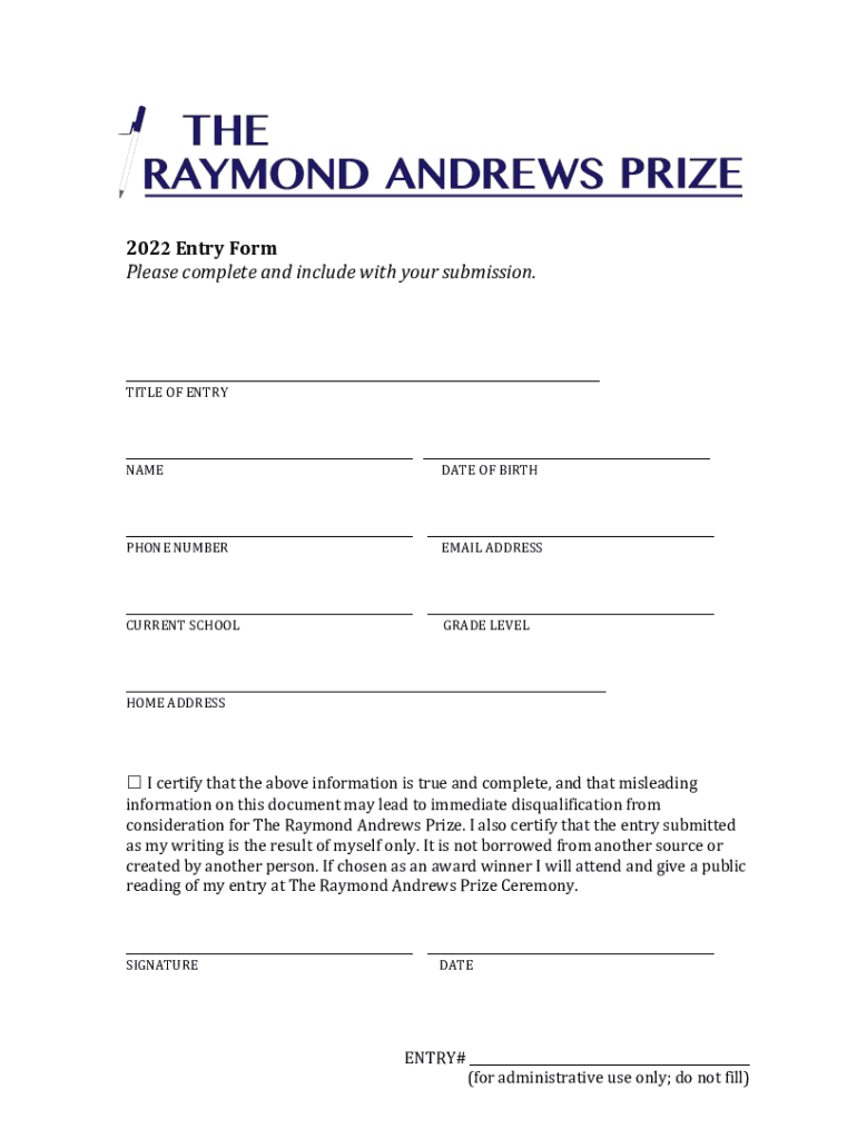 2022 Entry FormPlease complete and include with your submission.___TITLE OF ENTRY______NAMEDATE OF BIRTH______PHONE NUMBEREMAIL ADDRESS______CURRENT SCHOOLGRADE LEVEL___HOME ADDRESS I certify that