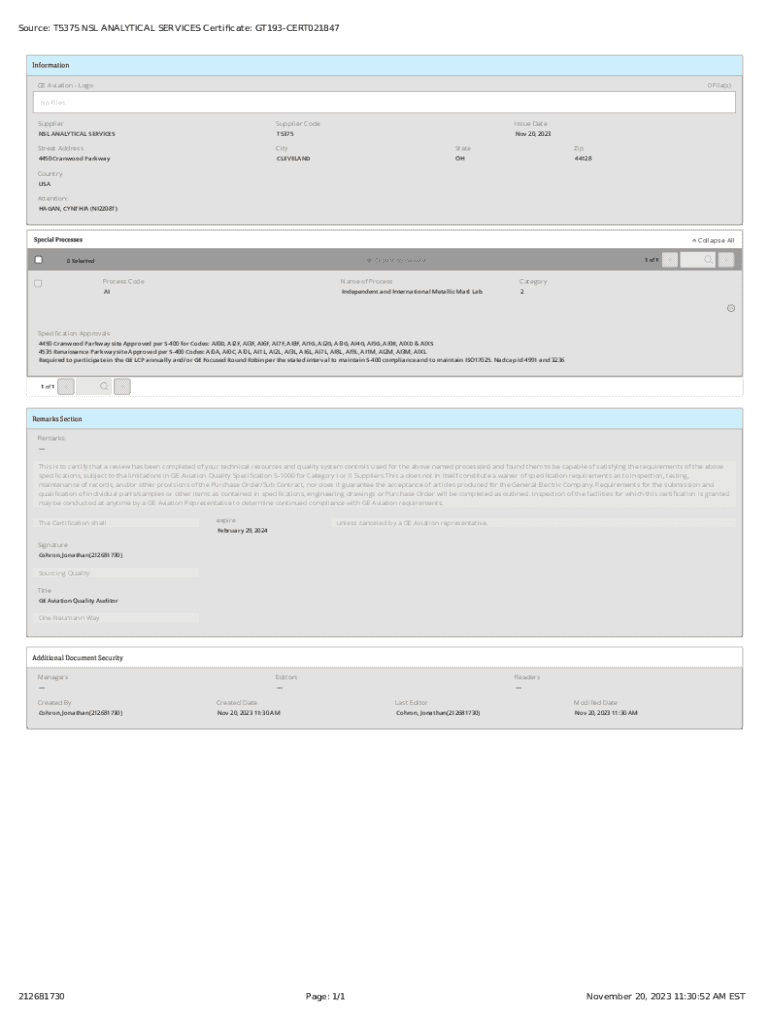 Source: T5375 NSL ANALYTICAL SERVICES Certicate: GT193CERT021847Information GE Aviation Logo0 File(s)No Files SupplierSupplier CodeNSL ANALYTICAL SERVICEST5375Issue DateStreet AddressCityStateZip4450