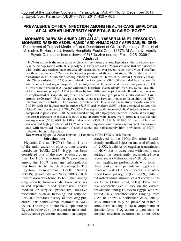 Journal of the Egyptian Society of Parasitology, Vol. 47, No. 3, December 2017 J. Egypt. Soc. Parasitol. (JESP), 47(3), 2017: 459 466PREVALENCE OF HCV INFECTION AMONG HEALTH CARE EMPLOYEE AT AL AZHAR