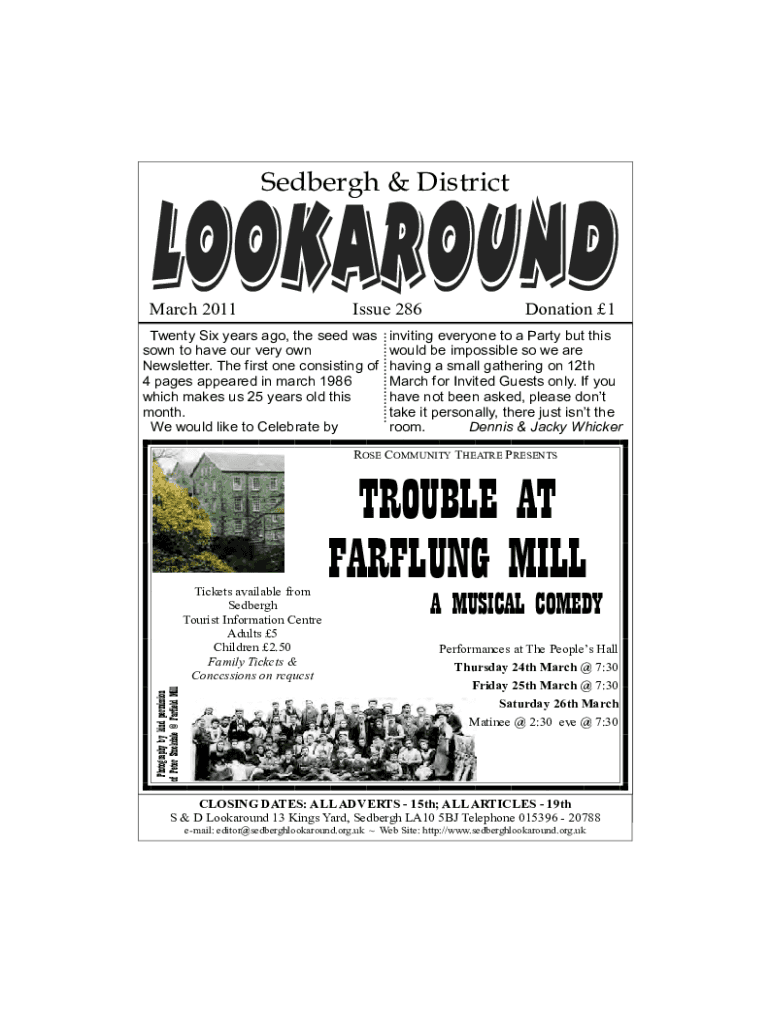 Sedbergh & DistrictMarch 2011Issue 286Twenty Six years ago, the seed was sown to have our very own Newsletter. The first one consisting of 4 pages appeared in march 1986 which makes us 25 years old