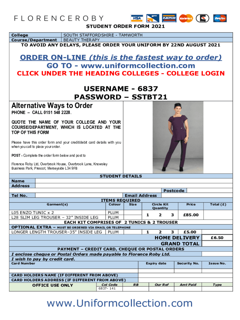 STUDENT ORDER FORM 2021 College Course/DepartmentSOUTH STAFFORDSHIRE TAMWORTH BEAUTY THERAPYTO AVOID ANY DELAYS, PLEASE ORDER YOUR UNIFORM BY 22ND AUGUST 2021ORDER ONLINE (this is the fastest way