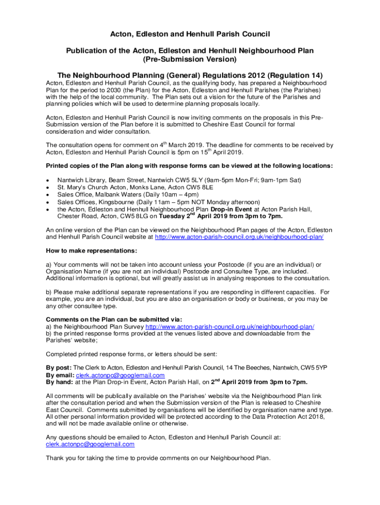 Acton, Edleston and Henhull Parish Council Publication of the Acton, Edleston and Henhull Neighbourhood Plan (PreSubmission Version) The Neighbourhood Planning (General) Regulations 2012 (Regulation