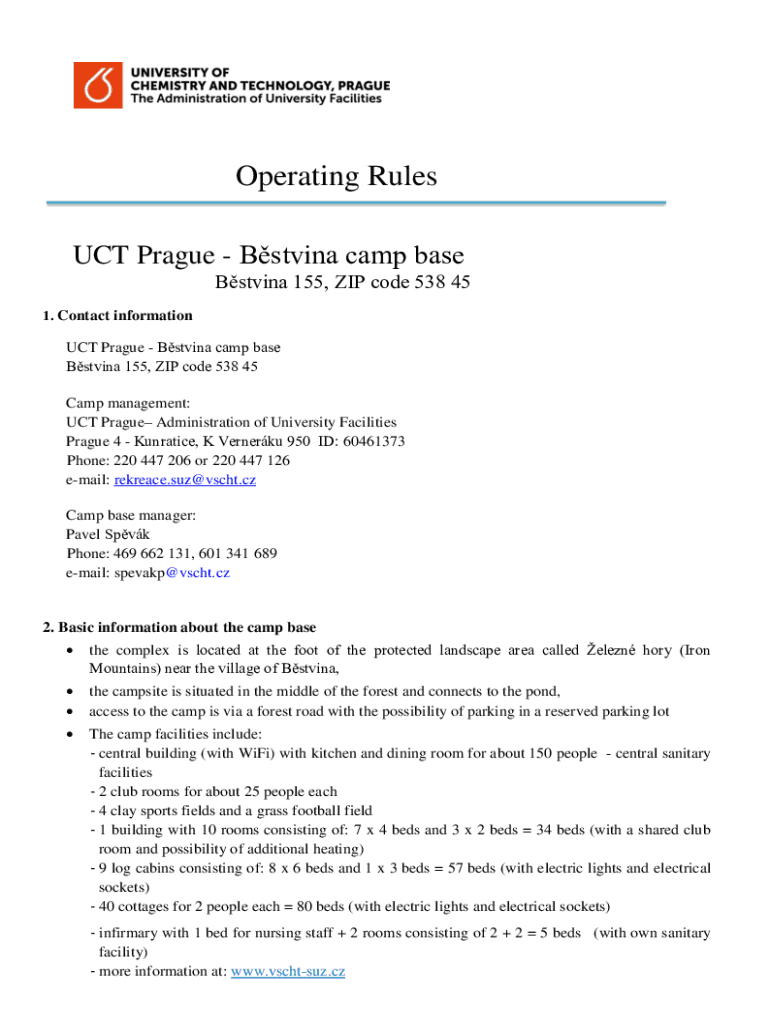 Operating Rules UCT Prague Bstvina camp base Bstvina 155, ZIP code 538 45 1. Contact informationUCT Prague Bstvina camp base Bstvina 155, ZIP code 538 45 Camp management: UCT Prague Administration