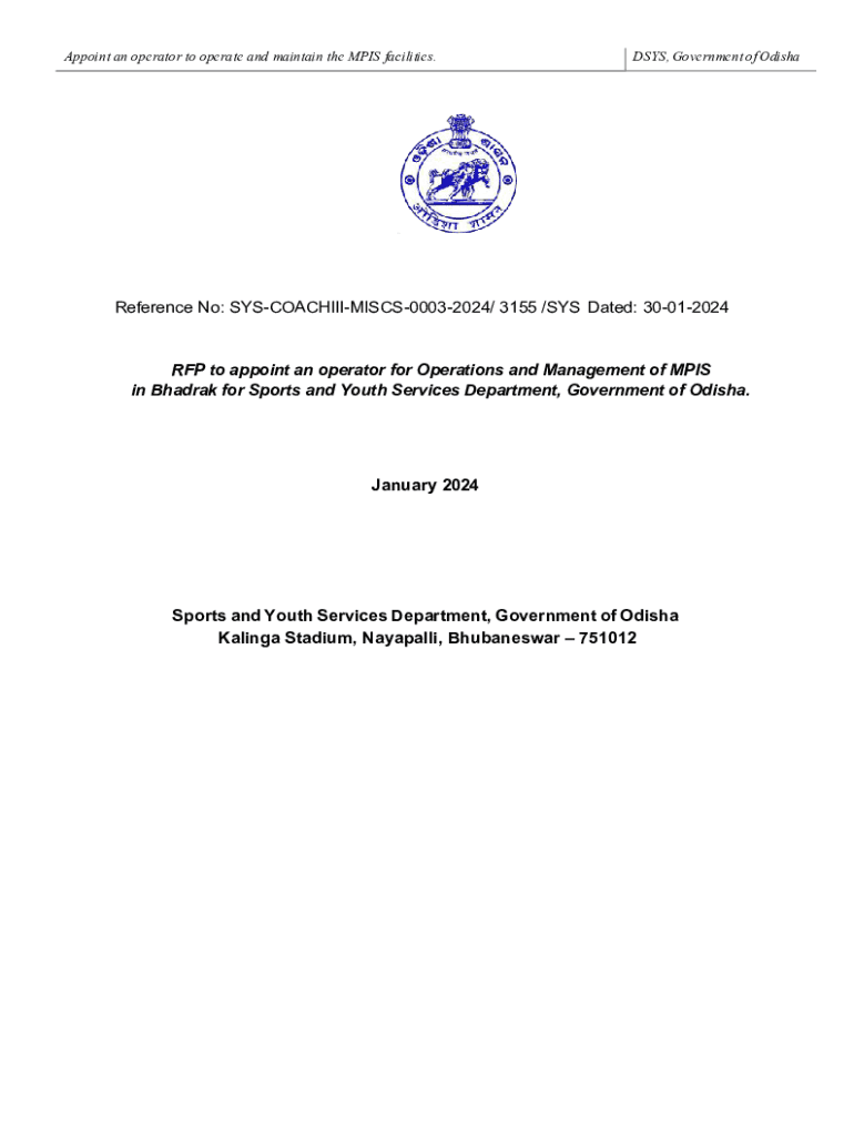 Appoint an operator to operate and maintain the MPIS facilities.DSYS, Government of OdishaRRRRReference No: SYSCOACHIIIMISCS00032024/ 3155 /SYS Dated: 30012024RFP to appoint an operator for Operations