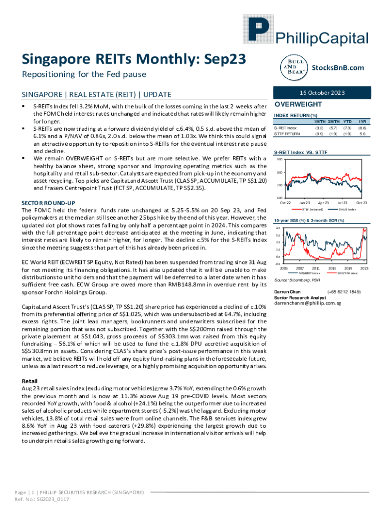 Singapore REITs Monthly: Sep23 Repositioning for the Fed pause 16 October 2023SINGAPORE | REAL ESTATE (REIT) | UPDATE SREITs Index fell 3.2% MoM, with the bulk of the losses coming in the last 2 weeks