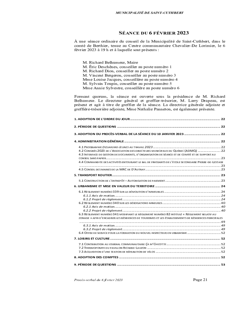MUNICIPALIT DE SAINTCUTHBERTSANCE DU 6 FVRIER 2023 une sance ordinaire du conseil de la Municipalit de SaintCuthbert, dans le comt de Berthier, tenue au Centre communautaire ChevalierDe Lorimier,