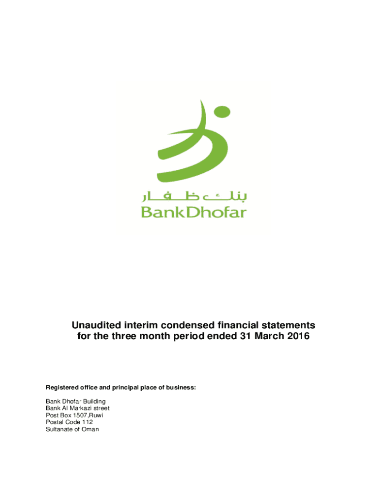 Unaudited interim condensed financial statements for the three month period ended 31 March 2016Registered office and principal place of business: Bank Dhofar Building Bank Al Markazi street Post Box