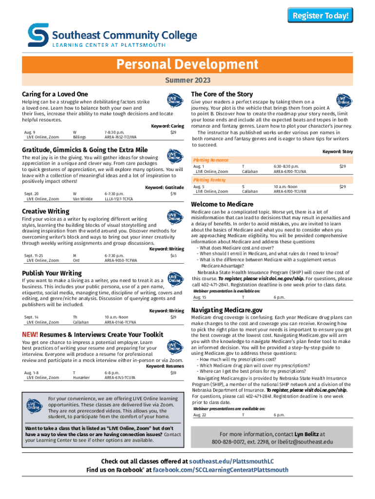 Register Today!Personal Development Summer 2023 Caring for a Loved OneHelping can be a struggle when debilitating factors strike a loved one. Learn how to balance both your own and their lives, increase