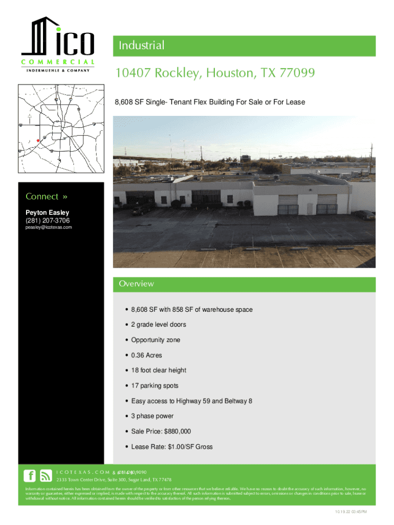 Industrial10407 Rockley, Houston, TX 77099 8,608 SF Single Tenant Flex Building For Sale or For LeaseConnect Peyton Easley (281) 2073706 peasley@icotexas.comOverview 8,608 SF with 858 SF of warehouse
