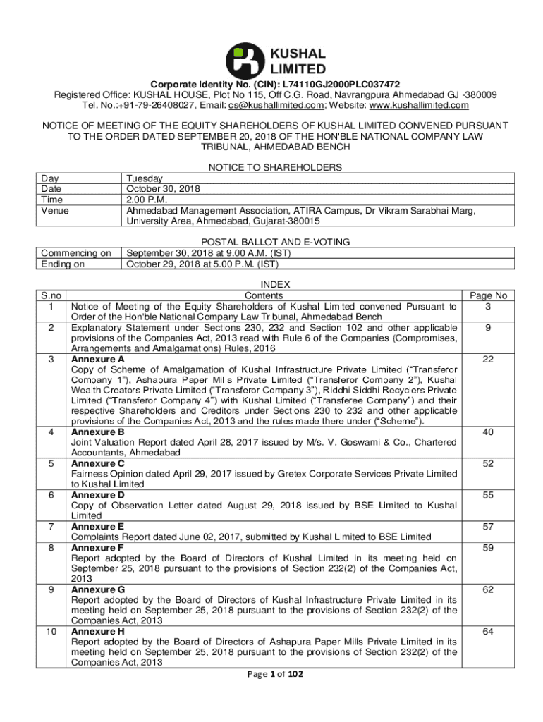 Corporate Identity No. (CIN): L74110GJ2000PLC037472 Registered Office: KUSHAL HOUSE, Plot No 115, Off C.G. Road, Navrangpura Ahmedabad GJ 380009 Tel. No.:+917926408027, Email: cs@kushallimited.com;