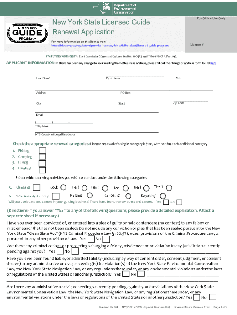 For Office Use OnlyNew York State Licensed Guide Renewal Application For more information on this license visit: https://dec.ny.gov/regulatory/permitslicenses/fishwildlifeplant/licensedguideprogramLicense