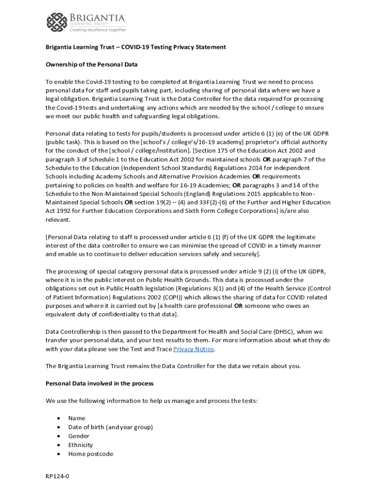 Brigantia Learning Trust COVID19 Testing Privacy Statement Ownership of the Personal Data To enable the Covid19 testing to be completed at Brigantia Learning Trust we need to process personal data