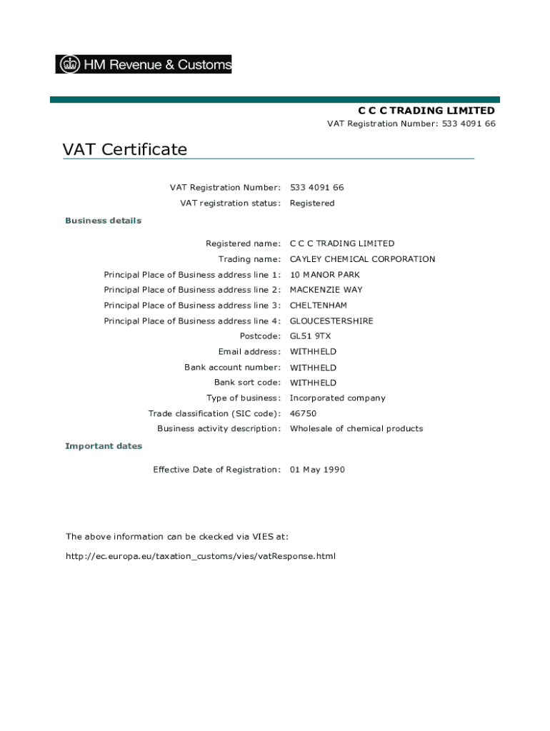 Page 1 of 1HomeCymraegContact HMRCHelpSign outC C C TRADING LIMITED VAT Registration Number: 533 4091 66VAT Certificate VAT Registration Number: VAT registration status:533 4091 66 RegisteredBusiness